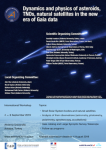 Daha fazlasını bul »Akdeniz Üniversitesi Uzay Bilimleri ve Teknolojileri Bölümü'nün düzenlediği "Dynamics and Physics Of Asteroids, TNOs and Natural Satellites in the New Era of GAIA Data" adlı çalıştay 4-6 Eylül 2019 tarihlerinde Akdeniz Üniversitesi'nde gerçekleştirilecektir. Uluslararası nitelikte düzenlenen çalıştayın dili İngilizcedir. Çalıştayda Güneş Sistemi'ndeki asteroid, küçük gezegen ve uydular gibi küçük cisimler ele alınacaktır. Türk Astronomi Derneği'nin de destek verdiği çalıştay hakkında daha fazla bilgi çalıştay websitesinden alınabilir.
